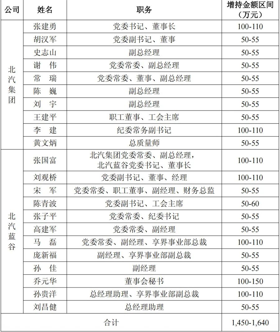 据公告内容,北汽集团方面,包括集团董事长张建勇在内的10人进行增持,张建勇增持金额区间为100-110万元;北汽蓝谷方面,董事长张国富、总经理刘观桥等12人进行增持,张国富增持金额100-110万元,刘观桥增持金额100-110万元。