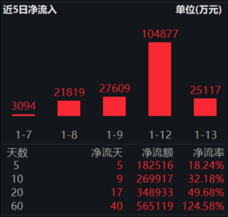 工业有色ETF(560860)紧密跟踪中证工业有色金属主题指数,覆盖铜、铝、稀土等战略资源龙头。该基金持续吸引资金青睐,前一交易日(1月13日)资金净流入2.5亿,过去5个交易日连续获得资金净流入合计18.25亿元,近10日“吸金”近27亿。
