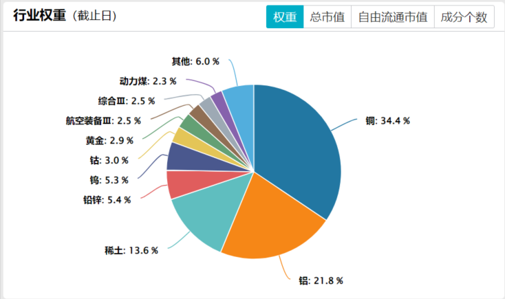 指数前十大成分股汇聚了各工业金属细分领域的绝对龙头,权重集中。前十大权重股包括洛阳钼业、北方稀土、中国铝业、云铝股份、江西铜业、兴业银锡、铜陵有色、西部矿业、厦门钨业、天山铝业,合计占比达56.18%。