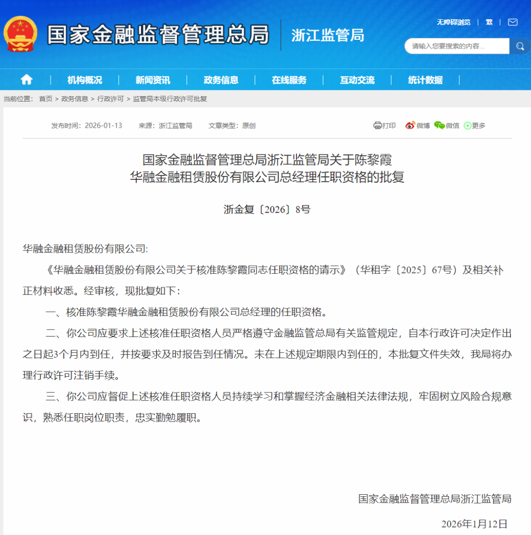 1月13日,浙江金融监管总局发布公告,核准批复陈黎霞华融金租总经理的任职资格。