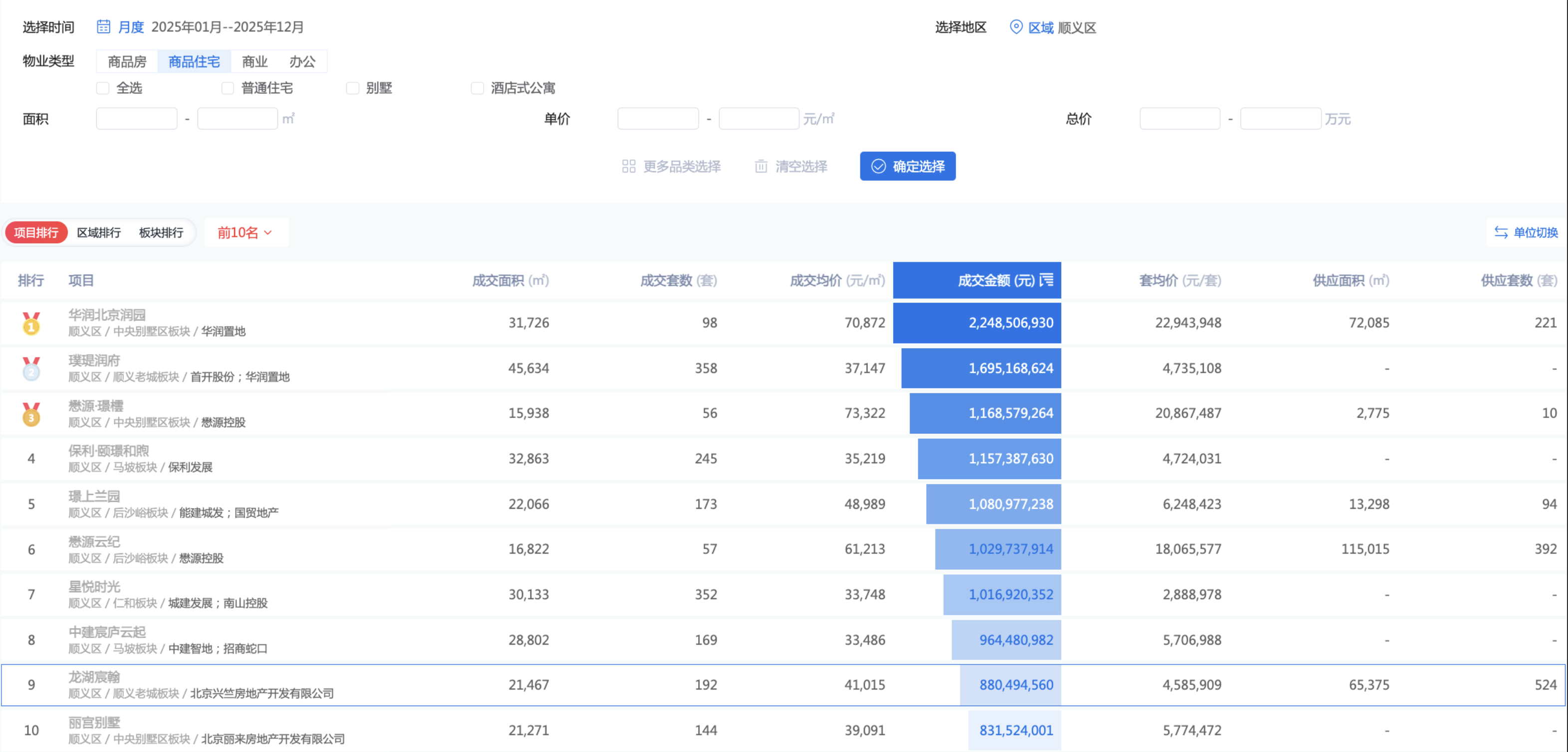 北京进深徐迪顺义区2025年度商品住宅网签金额排行榜出炉。