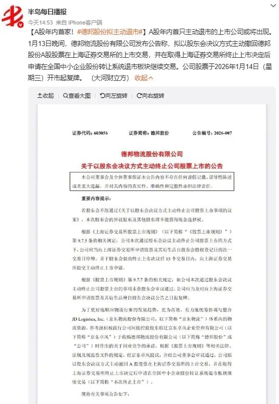 1月13日,德邦公告拟主动撤回A股上市交易,京东物流为异议股东及其他股东提供每股19元的现金选择权,预计耗资37.97亿元。