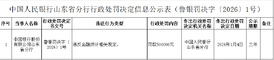 1月14日金融一线消息,中国人民银行山东省分行行政处罚决定信息公示表显示,中国银行股份有限公司山东省分行因违反金融统计相关规定,被中国人民银行山东省分行罚款500000元。