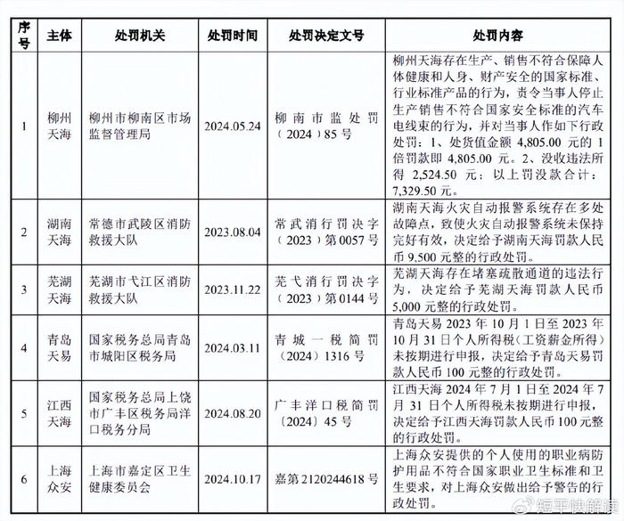 5月,柳州天海存在生产、销售不符合保障人体健康和人身、财产安全的国家标准、行业标准产品的行为,被责令停止生产不符合国家安全标准的产品,没收违法所得并罚款合计7329.50元。