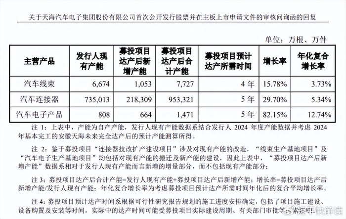 2024年,三大产品的产能分别为735,013万件、6,424万根、808万件,即本次扩产分别是现有产能的29.7%、16.39%、82.15%。需要指出的是,首轮问询函中,汽车连接器、汽车电子产品现有产能与招股书中2024年一致,而汽车线束则存在差异,问询函中为6,674万根。