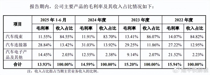 汽车线束贡献超8成收入,毛利率连降。天海电子主营业务收入主要由汽车线束贡献,报告期内实现收入分别为66.82亿元、95.64亿元、101.11亿元、52.6亿元,收入占比均在8成以上,分别为84.82%、86.07%、83.7%、84.55%。