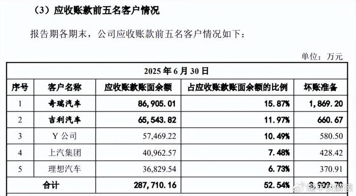 进一步来看,应收账款过半集中在前五名客户,期末应收账款账面余额合计28.77亿元,占比52.54%,坏账准备0.39亿元。公司期末对奇瑞汽车、吉利汽车、Y公司、上汽集团、理想汽车的应收账款账面余额分别为8.69亿元、6.55亿元、5.75亿元、4.1亿元、3.68亿元,对应的坏账准备分别为1,869.20万元、660.67万元、580.50万元、428.42万元、370.91万元。