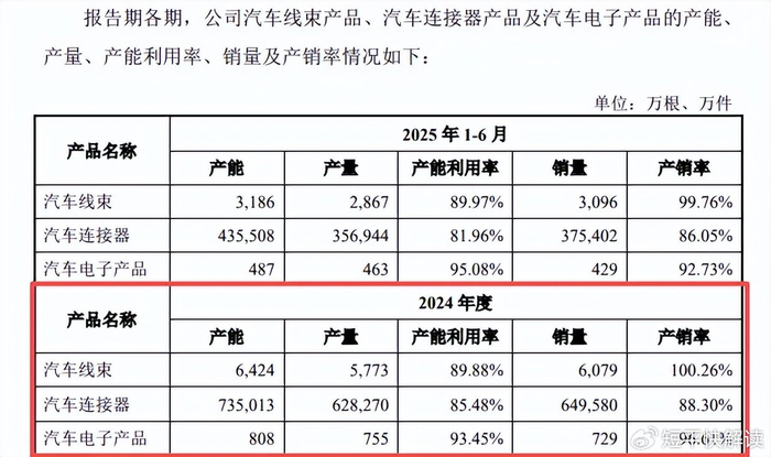 2022年至2025年1-6月(报告期),公司汽车连接器产能利用率分别为82.97%、85.19%、85.48%、81.96%;汽车线束分别为87.26%、87.58%、89.88%、89.97%;汽车电子产品分别为90.77%、82.05%、93.45%、95.08%。