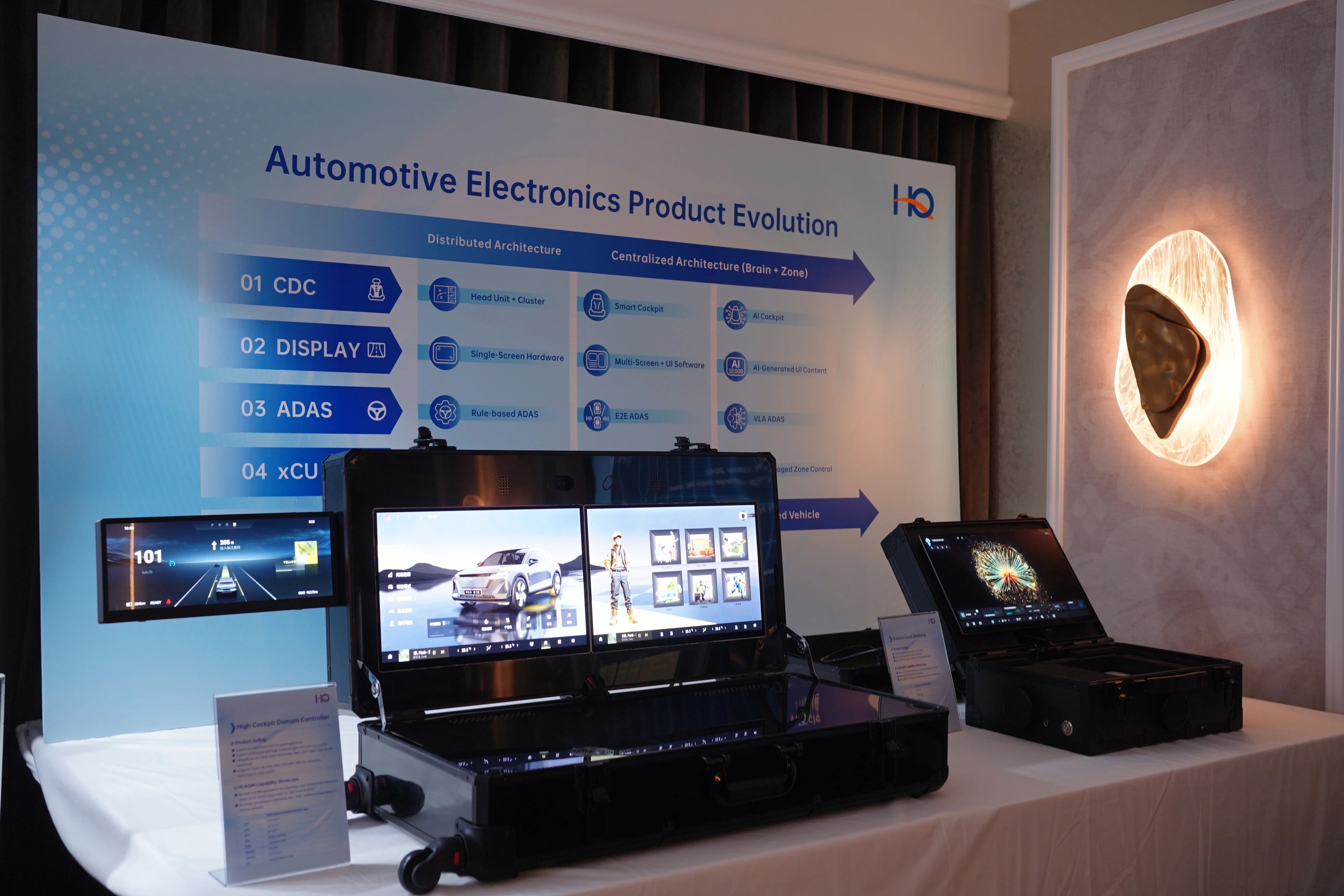 华勤汽车已完成座舱域产品从入门到旗舰的全系产品覆盖。具备从硬件底层、软件中间件到上层HMI设计的完整全栈开发与量产经验。顺应行业域集成趋势,华勤汽车座舱方案可高度集成T-BOX、网关、数字钥匙等扩展功能。本次重点展出了基于QCM8538开发的行业首批量产定点的高端座舱域控制器以及一款高性价比的AI Box产品,旨在赋能现有座舱系统,增强端侧大模型计算能力,为用户带来更智能、更敏捷的交互体验。