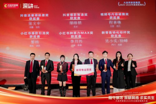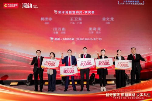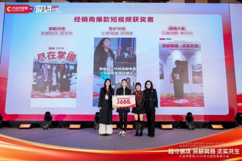 值得一提的是,为激活品牌传播新势能、释放内容创作活力,本次大会特别设置“经销商爆款短视频征集活动”。会上,大自然家居集团副董事长袁顺意为活动中的优秀创作者颁奖。