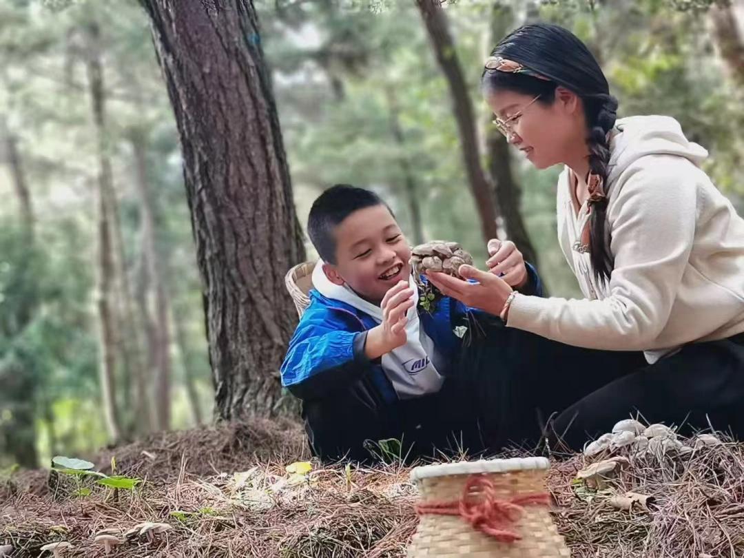 在马场镇平阳村的“自然课堂”里,孩子们蹲在林下,跟着村民辨识赤松茸、鹿茸菇,指尖沾着泥土,眼里闪着好奇。