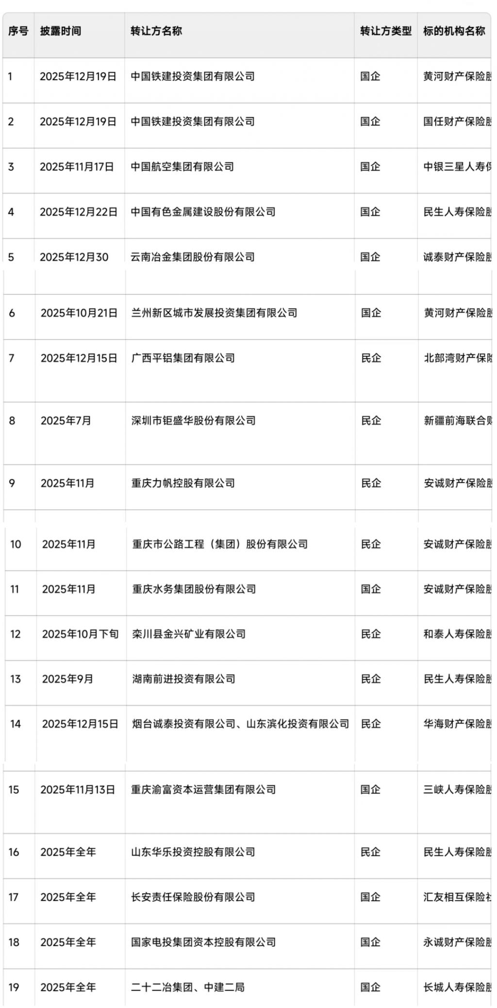 这一政策直接导致大量国企股东撤离保险领域,仅 2025 年就有中铁投资、国家电投、中航集团等十余家国企挂牌转让险企股权,且多为"清仓式"退出。