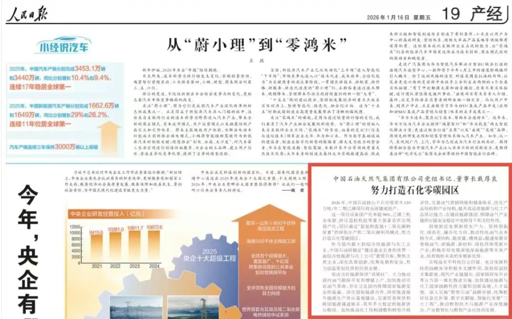 2026年1月16日,中国石油天然气集团有限公司党组书记、董事长戴厚良接受《人民日报》专题采访时表示,作为国内最大的综合性能源与化工企业,中国石油将锚定“建设基业长青的世界一流综合性能源与化工公司”愿景目标,因地制宜发展新质生产力,提速发展新能源等新兴产业,培育制胜未来的发展新优势。