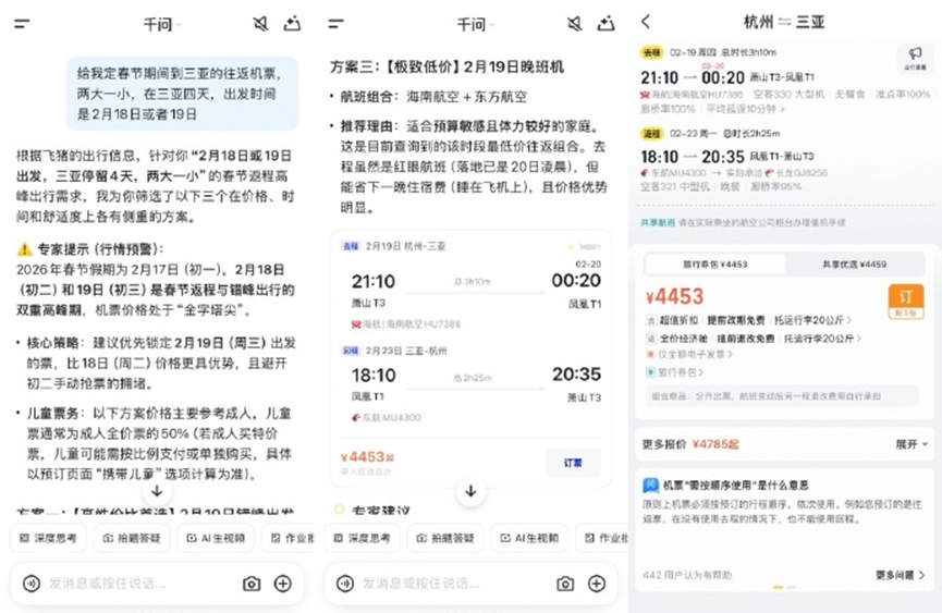 千问此次升级,最关键的变化并非“接入了多少应用”,而是接入方式的不同。它不是把用户从一个入口导向另一个App,而是以Agent的形式,在后台完成飞猪查机酒、淘宝选商品、闪购备补给、支付宝完成支付的完整协同。用户只需一句话,流程在后台自动完成。