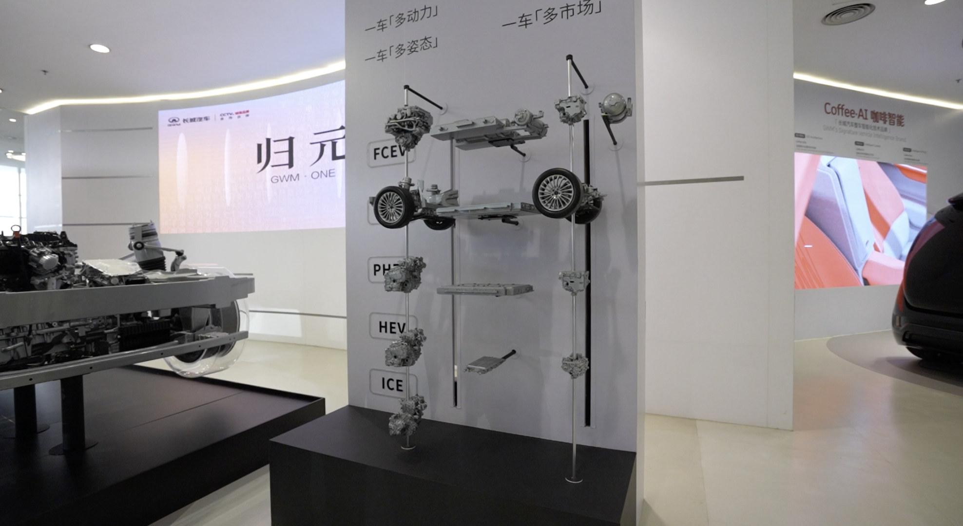 从已公开的信息来看,归元平台在动力形式上的覆盖范围较广。该平台可支持汽油、柴油、插电式混合动力、混合动力、纯电以及氢燃料电池等多种技术路线,涵盖 PHEV、HEV、BEV、ICE、FCEV 等多种动力形式。发布会现场,长城汽车并未明确给出某一动力形式的优先级,而是反复提到全球不同地区在充电条件、能源结构和使用场景上的差异。