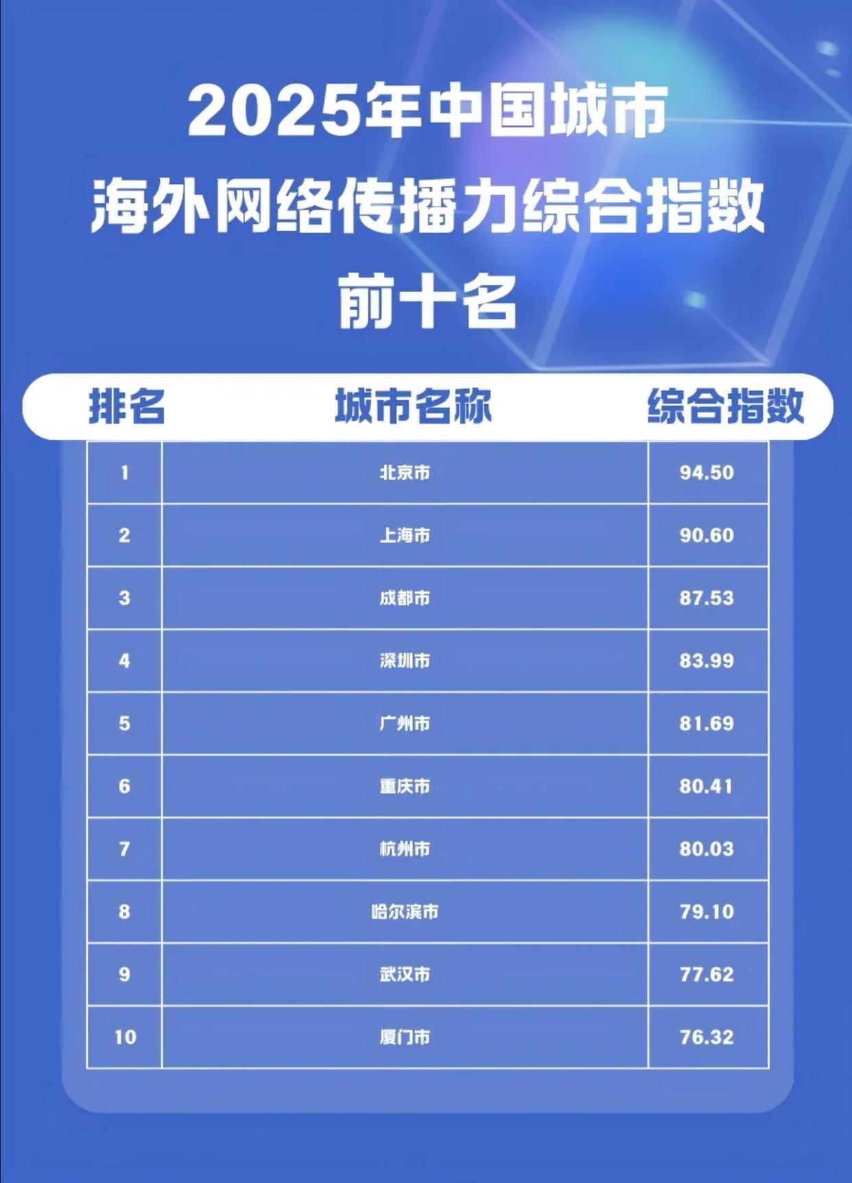 《2025中国城市海外网络传播力建设报告》显示,2025年中国338座城市(自治州、地区、盟)海外网络传播力综合指数前十名依次是:北京市、上海市、成都市、深圳市、广州市、重庆市、杭州市、哈尔滨市、武汉市、厦门市。