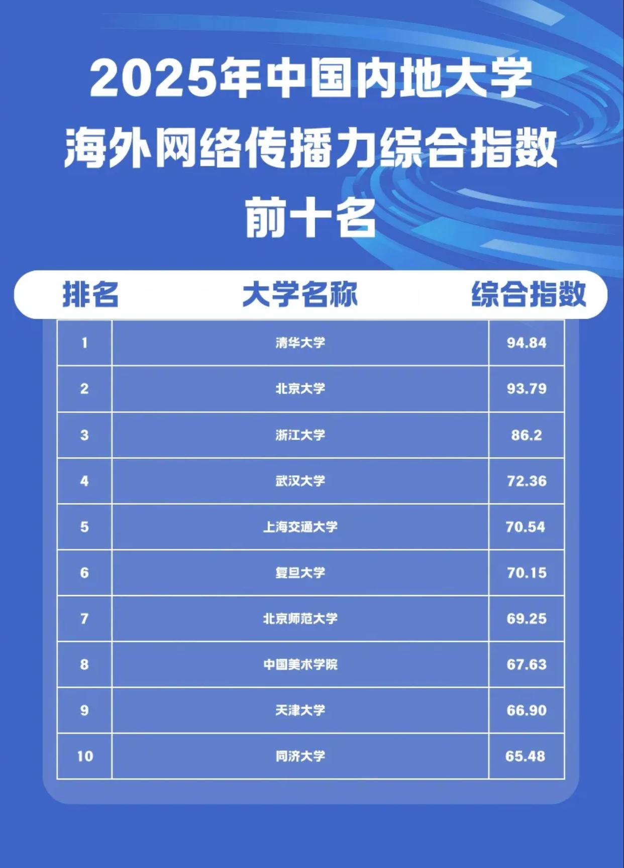 《2025中国大学海外网络传播力建设报告》显示,2025年中国193所大学海外传播力综合指数排名前十名的大学依次为:清华大学、北京大学、浙江大学、香港科技大学、香港大学、香港理工大学、香港城市大学、武汉大学、台湾大学、上海交通大学。