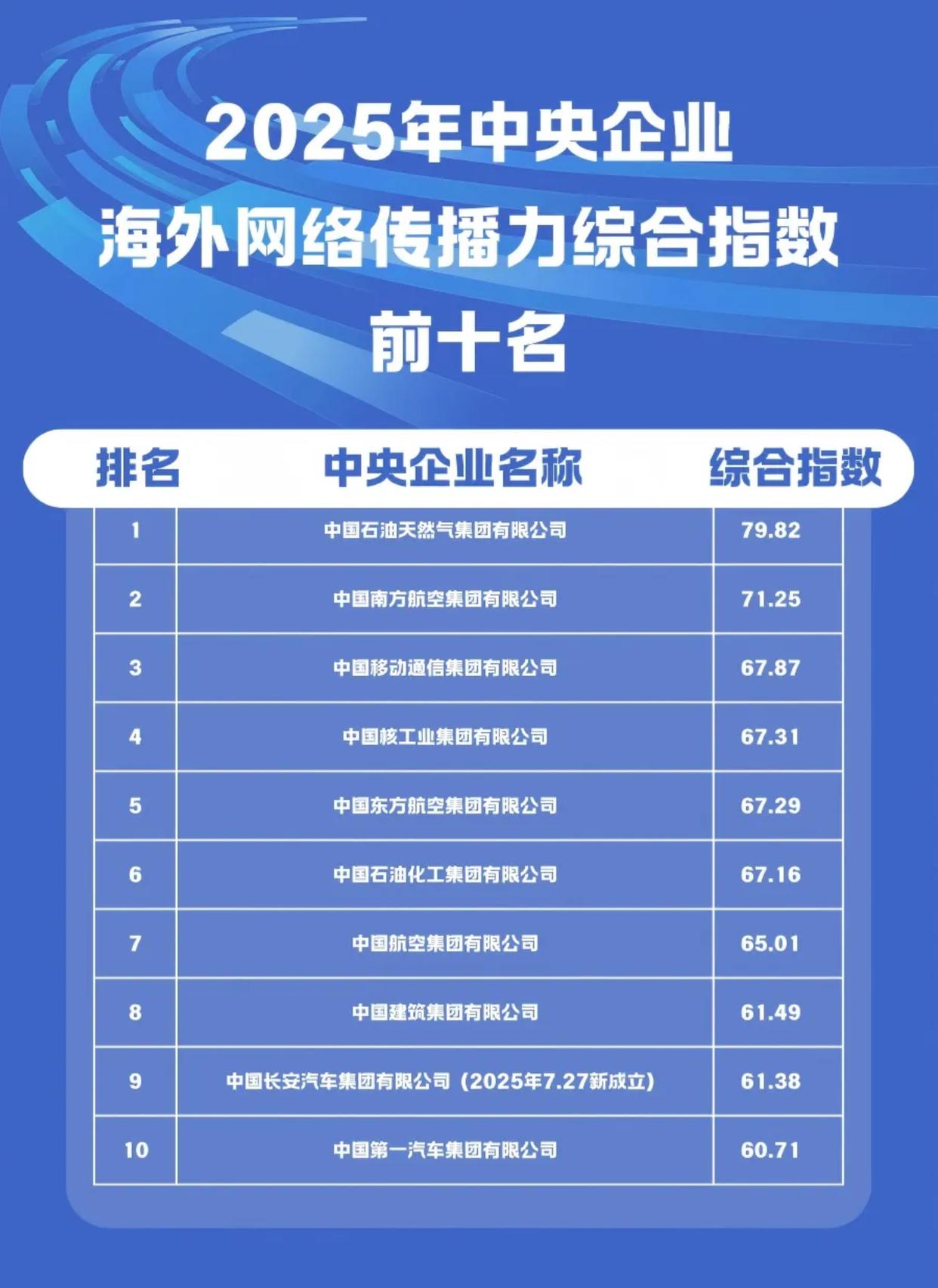 《2025中央企业海外网络传播力建设报告》显示,2025年100家中央企业海外传播力综合指数得分前十的中央企业依次为:中国石油天然气集团有限公司、中国南方航空集团有限公司、中国移动通信集团有限公司、中国核工业集团有限公司、中国东方航空集团有限公司、中国石油化工集团有限公司、中国航空集团有限公司、中国建筑集团有限公司、中国长安汽车集团有限公司、中国第一汽车集团有限公司。