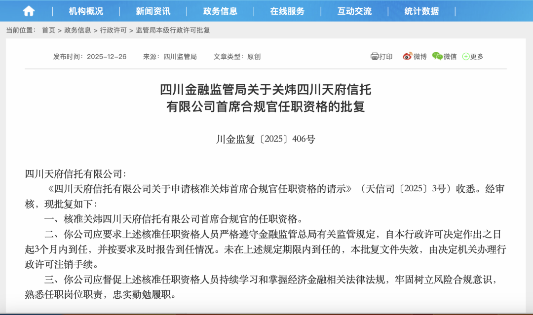 最近天府信托的核心高管团队总算全部到位了,董事长李跃、总裁杨豪这些关键岗位,都拿到了监管的任职批复,