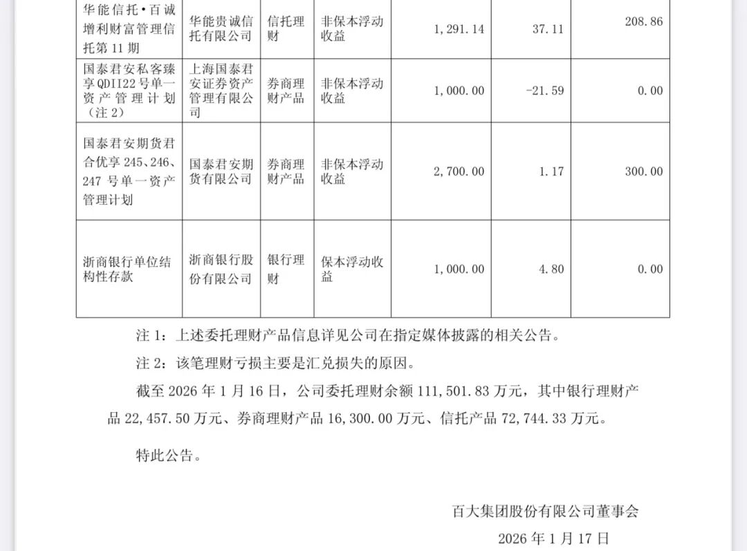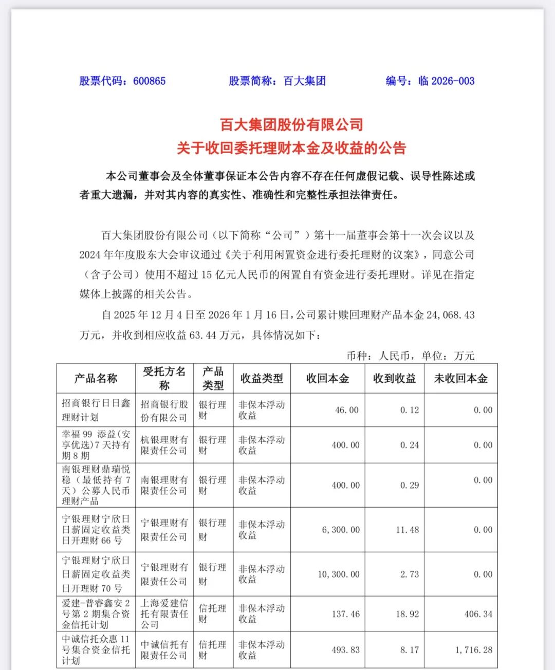 近日,百大集团股份有限公司(简称“百大集团”)发布临2026-003号公告,披露公司在2025年12月4日至2026年1月16日期间,累计赎回委托理财本金24,068.43万元,同时收获对应收益63.44万元,闲置资金理财运作取得阶段性成果。