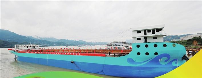 ①全球最大的纯电动散货船在秭归县华星船厂成功下水。三峡商报记者黄翔摄