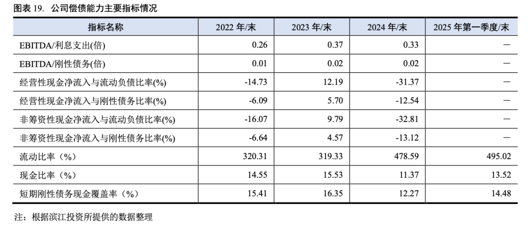 2024年公司EBITDA为4.80亿元,主要来源于列入财务费用的利息支出、利润总额和固定资产折旧;同期EBITDA/刚性债务为0.02倍,EBITDA对刚性债务的保障程度弱;EBITDA/利息支出为0.33倍,EBITDA不足以覆盖利息负担。