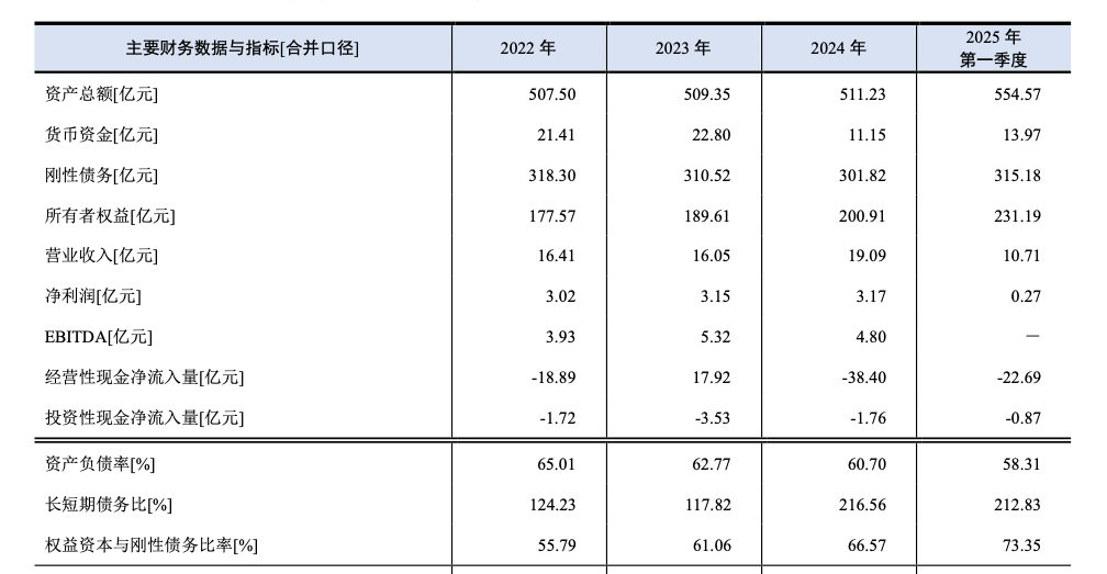 从债务期限结构来看,公司负债以长期负债为主,2024年末长短期债务比为216.56%,债务期限结构较为合理。整体来看,公司负债规模呈增长趋势,负债以长期为主结构较合理;公司刚性债务占比较大,以金融机构借款和发行债券为主;得益于大规模资本金投入,负债经营程度有所压降。