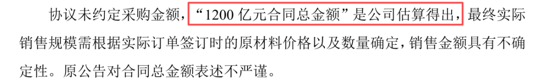 在公司公告发出后不久,当天上交所就向公司下发了问询函,问询函关注问题:公司提供的协议中,没有写金额,1200亿是怎么来的?且公司目前产能非常低,怎么匹配这么大的订单?