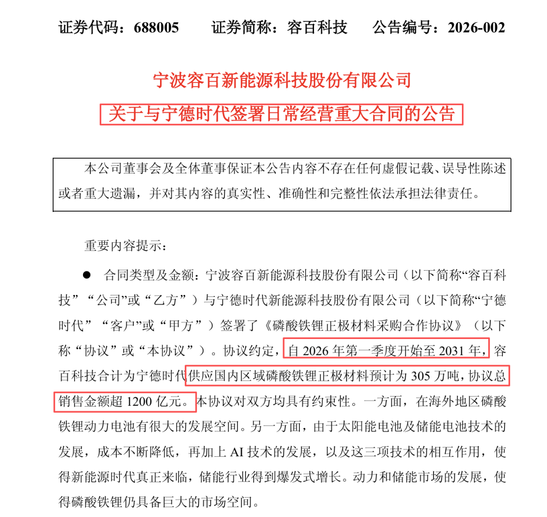 容百科技1月13日晚间发布《关于与宁德时代签署日常经营重大合同》的公告,公司从2026年一季度开始至2031年,为宁德时代供应国内区域磷酸铁锂正极材料305万吨,协议总销售金额超1200亿元。