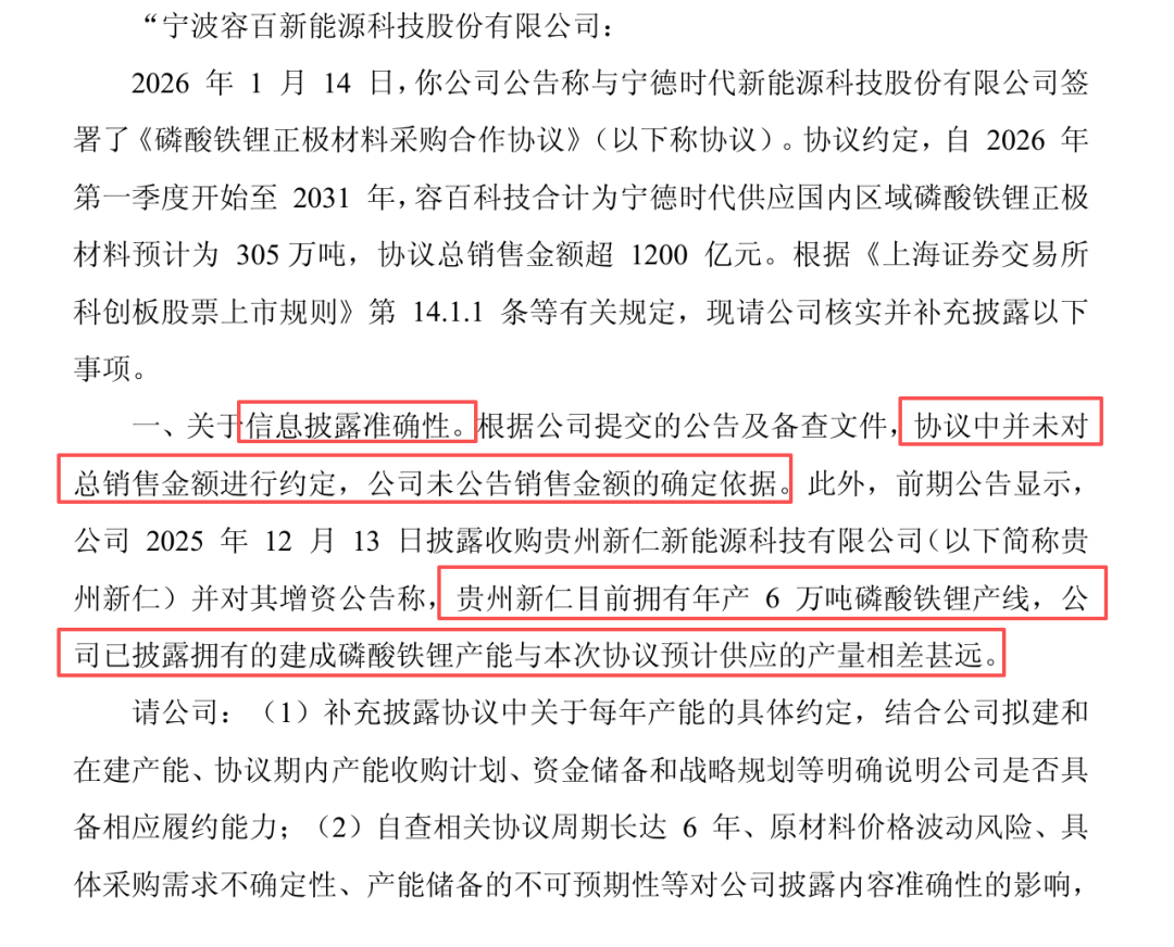 容百科技此前主要是覆盖三元材料、磷酸锰铁锂、钠电正极等正极材料,2025年才切入该赛道正式进入磷酸铁锂市场,你才刚进入赛道不久,就公告这么大的订单,监管肯定是要关注的。