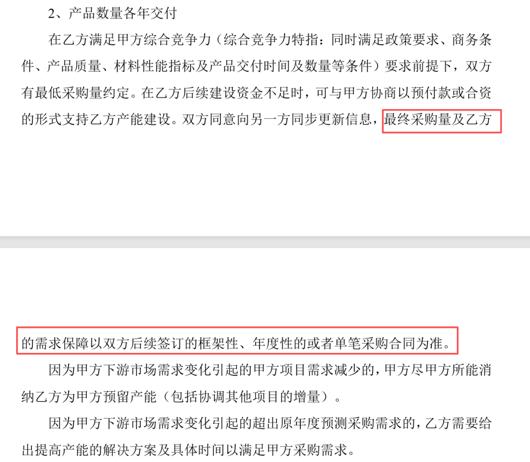 可以看到,要有强制义务才会触及违约,宁德时代本身就没有说要强制买你305万吨的量。而且协议里也说了,虽然有最低采购量,但是最终采购量以后续签订的采购合同为准。