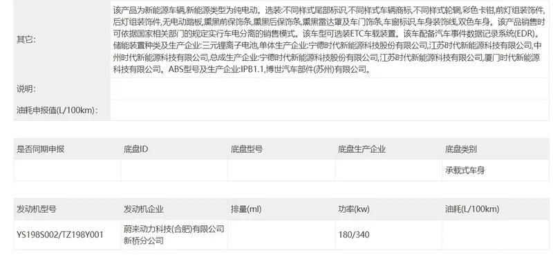 动力方面,工信部申报车型搭载了前后双电机,最大功率分别为180千瓦和340千瓦,综合功率520千瓦,综合扭矩700牛·米,与全新ES8保持一致。电池方面则来自宁德时代。