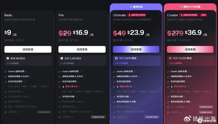在商业化方面,Elser.AI目前为用户提供了4种订阅方案,基础版9美元/月,提供每月900积分(约4分钟视频);增强版16.9美元/月,提供每月3800积分(约18分钟视频);终极版23.9美元/月,提供每月8800积分(约40分钟视频);创作者版36.9美元/月,提供每月19000积分(约90分钟视频)。阶梯式的定价策略覆盖了从个人爱好者到高频内容产出方的不同需求。