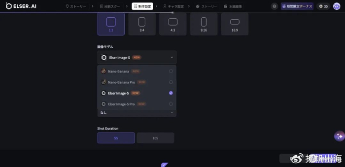 进入内容生产阶段,用户可设置生成名称、画面比例、模型类型及时长。模型层面,除了接入Nano Banana Pro,Elser.AI还提供自有图像模型Elser Image-S/ Image-S Pro,以及视频模型Elser Video-S / Video-S Pro / Video-K。
