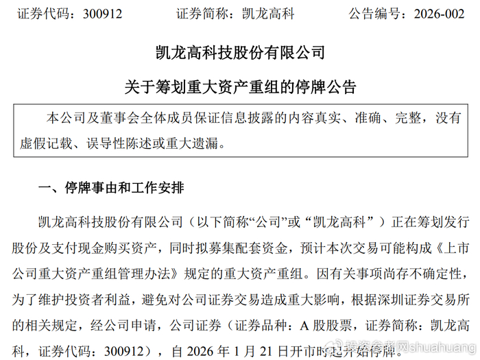 1月20日晚间,凯龙高科(300912)的一则停牌公告,让这家创业板上市公司再次进入资本市场视野。当日收盘,公司股价微跌1.24%,报19.85元/股,总市值仅22.8亿元——而就在股价承压的背后,是公司上市四年多来累计超6.6亿元的亏损窟窿,以及一场试图通过收购突围的转型布局。公告显示,公司拟以发行股份及支付现金方式收购深圳市金旺达机电有限公司(下称“金旺达”)控制权,并募集配套资金,股票自1月21日起停牌,预计10个交易日内披露交易方案,本次交易或构成重大资产重组。