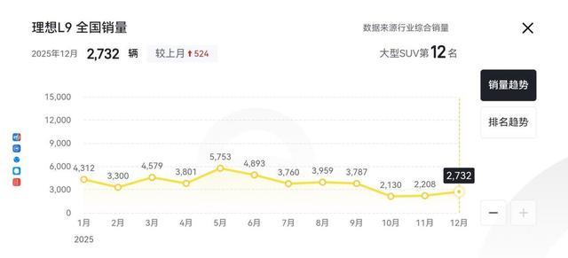从理想L9车系在整个2025年的销量表现情况来看,其总共卖出去了45214辆新车,位列大型SUV销量排行榜第五名的位置。