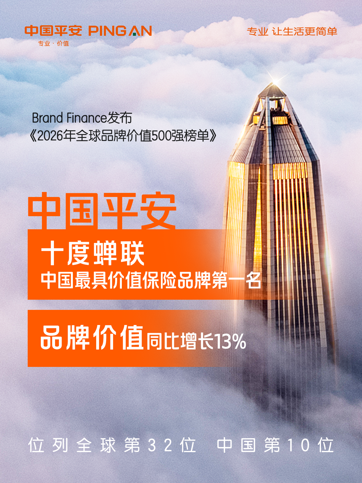 1月21日,国际权威品牌评估机构Brand Finance发布《2026年全球品牌价值500强榜单》。中国平安以488.39亿美元的品牌价值十度蝉联中国最具价值保险品牌第一名,位列全球第32位,较2025年提升3位,排名中国第10位,品牌价值同比增长13%。