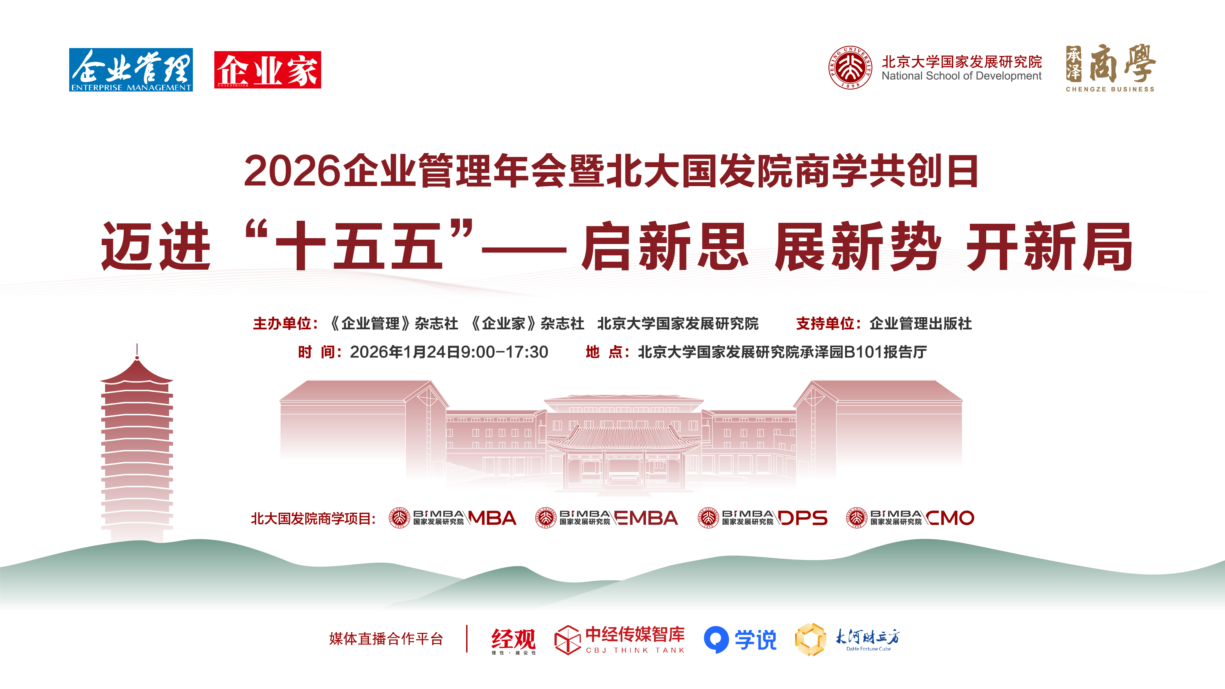 2026年是“十五五”的开局之年,也是中国企业应对百年变局,甚至利用百年变局的关键窗口期。在复杂多变的环境中,中国企业家如何在细处谋精益,在宽处谋布局,在高处争独到,成为摆在眼前的必答题。企业管理出版社、《企业管理》杂志社和《企业家》杂志社作为国资委下属中国企业联合会、中国企业家协会主管主办的“一书两刊”,长期关注中国企业家的成长和中国企业的管理问题。北大国发院作为中国的高端智库,始终坚持研究现实问题,尤其是国发院BiMBA商学院一直高度关切企业和企业家的发展。