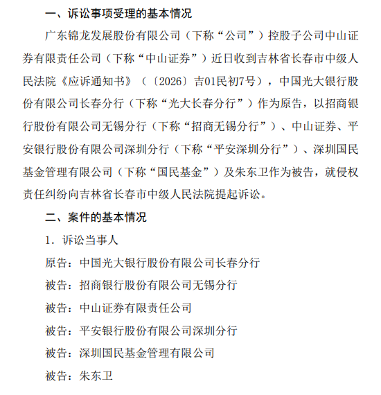 最近,中山证券收到一份法院通知:被光大银行长春分行告了。