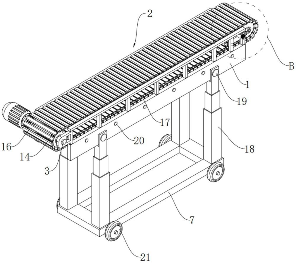 链板输送机主要包含机架、传动轴、环形链板。主动轴与从动轴通过带座轴承分设机架两端。在机架近主动轴端,对称固接有与机架一体成型的连接支架,支架内侧设有调节板,板上开有特定滑槽。调节件巧妙嵌于滑槽之中,可灵活滑动。同时,机架底部创新性地增设可升降底座,不仅提供稳固辅助支撑,更能灵活适应不同工艺场景下的设备高度需求。