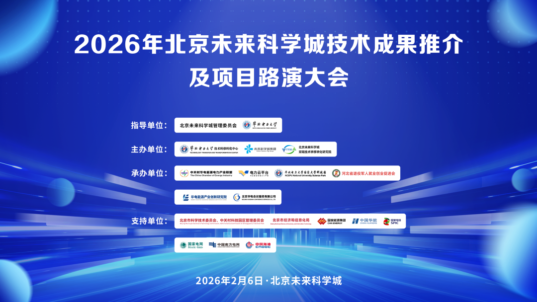 为深入推进“双碳”战略落地,强化未来科学城国际科技创新中心枢纽主平台在绿色能源领域的引领作用,集中展示区域内绿色能源技术创新成果,搭建政产学研金服用多方协同对接桥梁,赋能属地企业与产业链资源深度融合,在北京未来科学城管理委员会的指导下和北京市科学技术委员会、中关村科技园区管理委员会、北京市经济和信息化局的支持下,华北电力大学技术转移转化中心、北京市昌平区未来科学城双碳技术转移转化研究院、北京未来科学城产业发展有限公司、中关村华电能源电力产业联盟等单位将于2026年2月6日联合举办“2026年北京未来科学城绿色能源成果推介及项目路演大会(第一期)”。现将会议相关事宜通知如下: