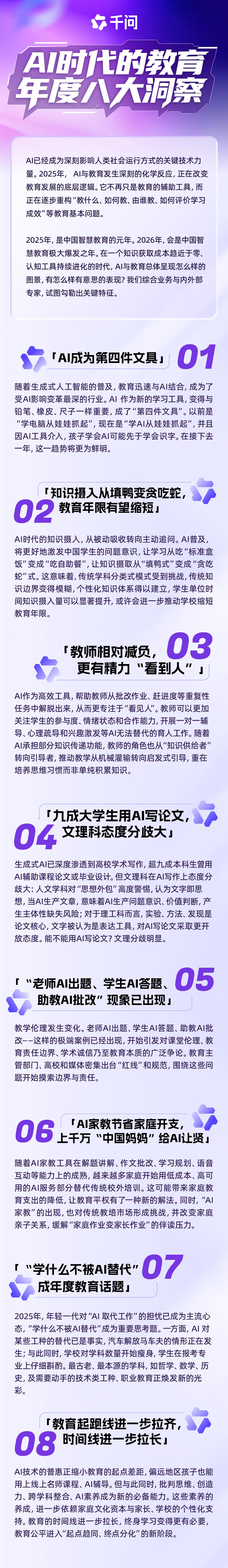 研讨会现场,千问发布了《AI时代的教育年度八大洞察》。千问APP正着重发力学习能力,阿里巴巴千问C端事业群智能学习业务负责人程飞指出AI已成为第四件文具,依赖铅笔、尺子的“求铅尺”的传统学习模式,在AI时代变成“求千问”;知识摄取方式从填鸭变“贪吃蛇”:知识来源方向高度不确定,自主学习中不断“吃掉”知识模块延长知识链,追问成为核心要义;教师相对减负,更有精力“看到人”;AI家教节省家庭开支,上千万“中国妈妈”正在给AI让贤……