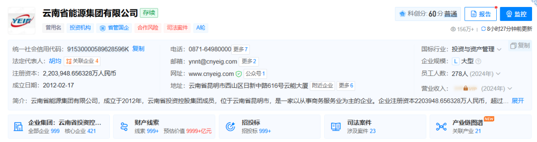 天眼查信息显示,云南省能源集团有限公司注册资本220.39亿,由云南省人民政府国有资产监督管理委员会下属云南省投资控股集团有限公司控股。截至2025年10月底,集团控股风光新能源装机448万千瓦,在建装机超260万千瓦。
