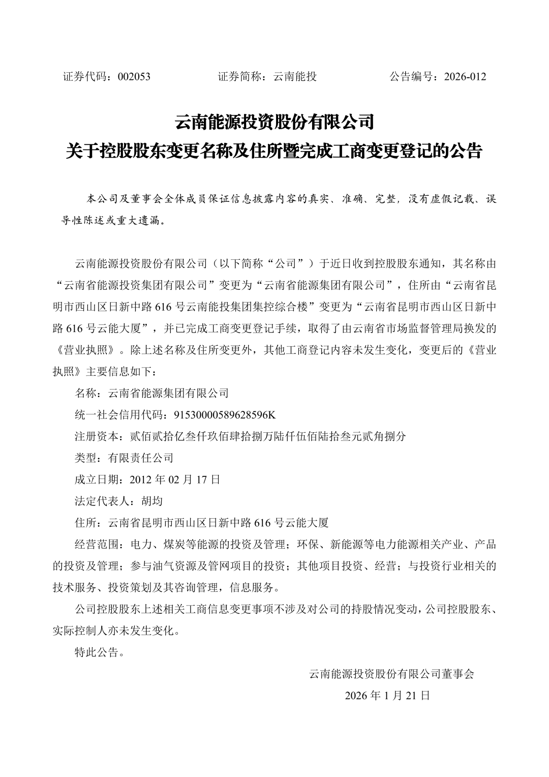 1月21日,云南能源投资股份有限公司发布《关于控股股东变更名称及住所暨完成工商变更登记的公告》。