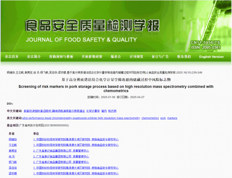品牌所属的袁记食品集团股份有限公司,携手中国检科院大湾区院联合攻关,共同发表学术论文,创新提出基于高分辨质谱法的猪肉新鲜度快速精准评估方案,为破解食品行业长期存在的肉类鲜度检测难题提供了科学可行的技术路径。