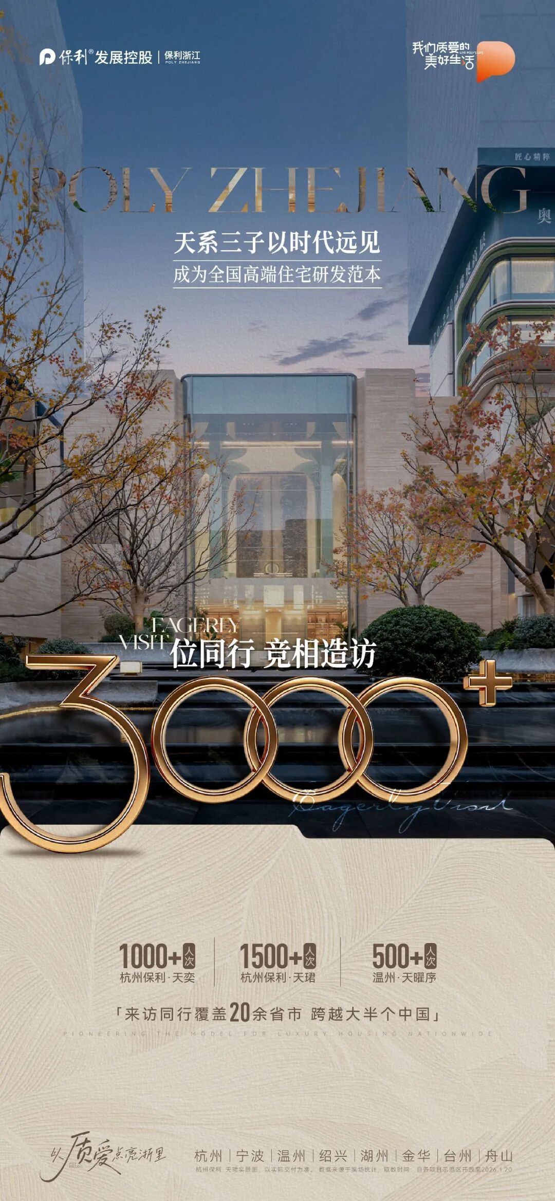 以杭州保利·天奕为例,自示范区开放以来,接待的全国同行已突破千人次。参访者北至新疆,南到广东、福建,东起上海、江苏,西至四川、湖北……跨越了十几个省市。超8000组高意向客户亲临现场品鉴,人气持续高涨。万科、绿城、融创、华润、中海等20余家一线开发商,以及多地规划局、设计研究院等50余家权威单位,均曾在此深度考察交流。(数据来源于案场统计,取数时间:自各项目示范区开放至2026.1.20)