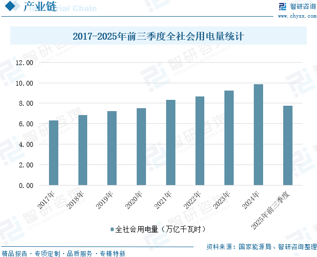 近年来,我国电力系统安全稳定运行,电力消费呈现稳中向好态势,电力供应持续绿色低碳转型,电力供需总体平衡。国家能源局数据显示,全社会用电量从2017年的6.31万亿千瓦时增长至2024年的9.85万亿千瓦时,年复合增长率为6.58%。2025年前三季度,全社会用电量为7.77万亿千瓦时,同比增长4.6%。其中,前三季度,第一产业用电量1142亿千瓦时,同比增长10.2%,增速比2024年同期提高3.3个百分点;第二产业用电量4.91万亿千瓦时,同比增长3.4%,占全社会用电量比重为63.2%;第三产业用电量1.51万亿千瓦时,同比增长7.5%,占全社会用电量比重为19.4%;城乡居民生活用电量1.24万亿千瓦时,同比增长5.6%,占全社会用电量比重为15.9%。随着经济社会持续发展和工业化进程深入推进,电力需求保持稳定增长,推动电力运行维护市场持续扩大。日益扩展的电力网络规模和日趋复杂的电力设施结构,对专业运维服务提出了更高要求,需要更多技术支持和维护保障以确保电力系统的安全稳定运行。