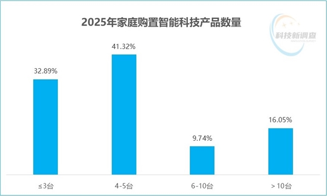 调查数据显示,智能科技产品已深度融入现代家庭生活。2025年,16.05%的用户家庭购置智能科技产品超过10件,9.74%的用户购置6-10件,合计超四成家庭拥有6件以上智能设备。这一持续增长的趋势,印证了我国智能科技普及红利的加速释放,也反映出消费者对智慧生活方式的深度认同。