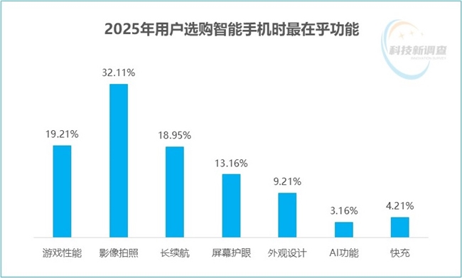 尽管手机厂商纷纷加码AI功能,但调查揭示了用户选择的理性回归。数据显示,仅有3.16%的用户因AI功能选购手机,而32.11%的用户最看重影像拍照,19.21%关注游戏性能,18.95%追求长续航。这一“反差”提示行业:技术创新需落地于用户痛点,避免陷入“参数内卷”的误区。