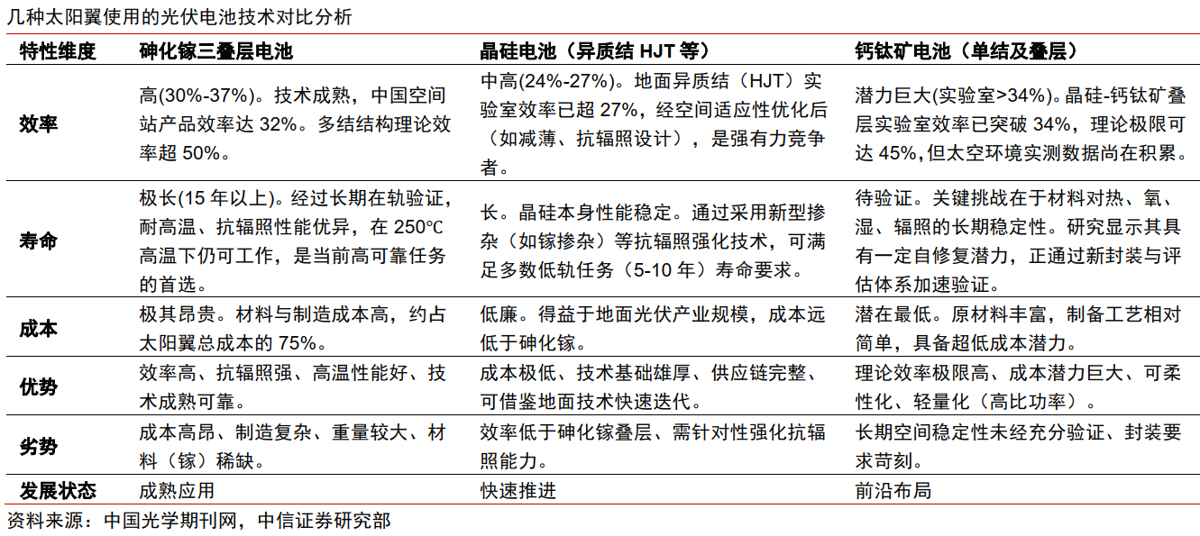中信建投同样认为,HJT电池在现有量产技术中抗辐射、轻量化优势最明显,2026年后渗透率预计将有所提升,并以执行低轨短期低成本低功率任务为主。钙钛矿及叠层电池有望凭借高比功率、抗辐射优势,在2028年后将逐步承担低轨星座及深空探测任务。